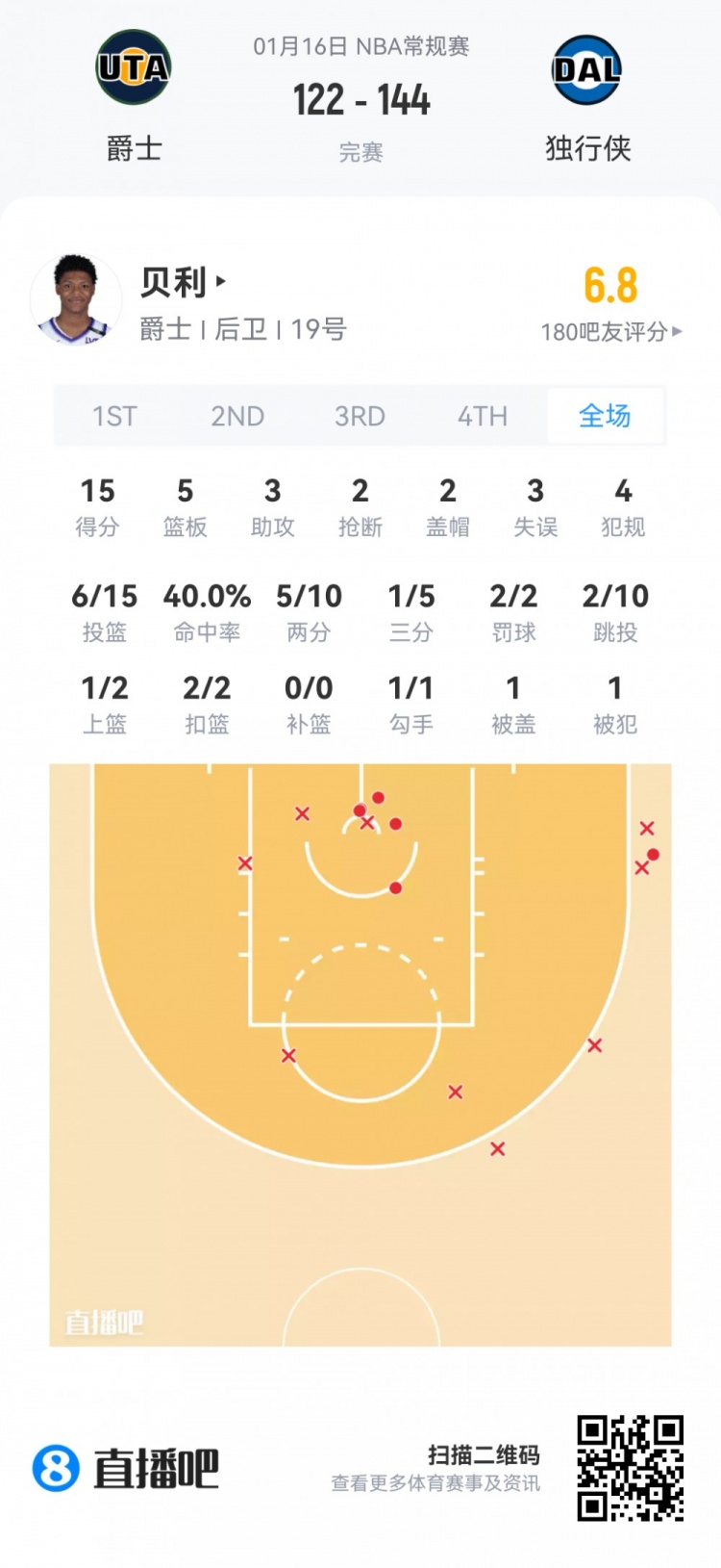 爵士首轮5号秀埃斯·贝利 登场30.4分钟