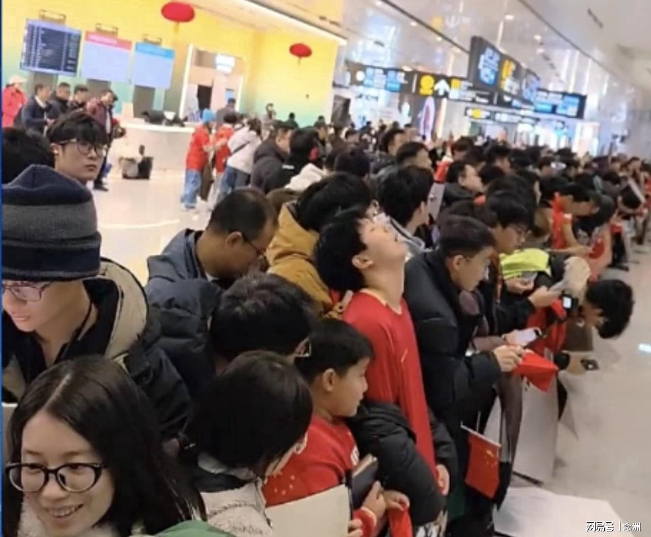 大量中国队球迷提前来到机场,等候U23国足凯旋归来,值得一提的是,U23国足的姚队医来自杭州,他们的公司还现场宣布奖励他10万元。其中一位70岁的大爷披着国旗,含泪说道:“这帮孩子是真不容易。”